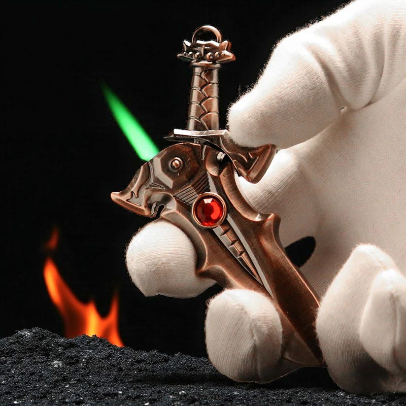 The Dragonslayer Lighter wields the mystique of legendary weaponry — sculpted in the form of an ancient sword and forged from solid metal for unwavering durability. Its intricate detailing, gem-like centerpiece, and vintage finish make it both a functional flame and a collectible relic.